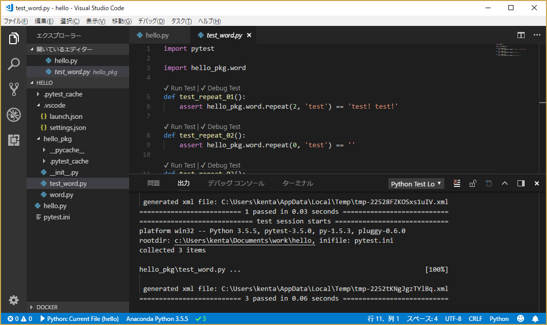 "py35"環境にpytestをインストールする。